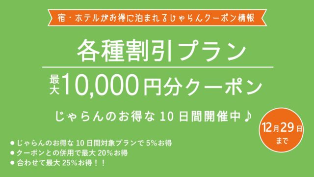 毎月20日から!お得に旅行にいける『じゃらんのお得な10日間』クーポン情報!!12/20(土)~12/29(月)