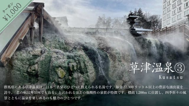 群馬県草津温泉③で使える1,000円引きふるさとお得クーポン配布中!!【じゃらん】【大人1名以上】【40歳以上】