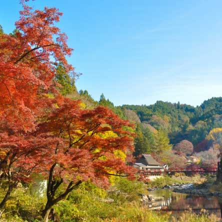 香嵐渓は愛知県豊田市足助町にある矢作川支流の巴川がつくる渓谷で、全国でも有数の紅葉の名所です。江戸時代の寛永11年に香積寺11世の三栄和尚が植樹したことがはじまりとされています。約4000本もの紅葉は、三栄和尚が「美しい自然を、より美しく」との願いを込めて植えられました。秋ばかりでなく、山野に咲く花々、春の息吹、夏の新緑など、四季折々の景色を楽しめるのも、香嵐渓の魅力となっています。