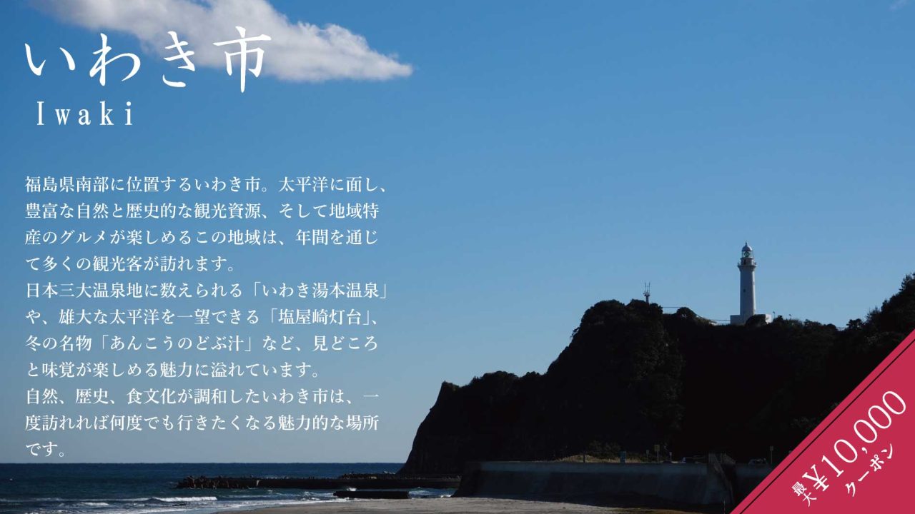 日本三大温泉地に数えられる「いわき湯本温泉」や、雄大な太平洋を一望できる「塩屋崎灯台」、冬の名物「あんこうのどぶ汁」など、見どころと味覚が楽しめる魅力に溢れています。