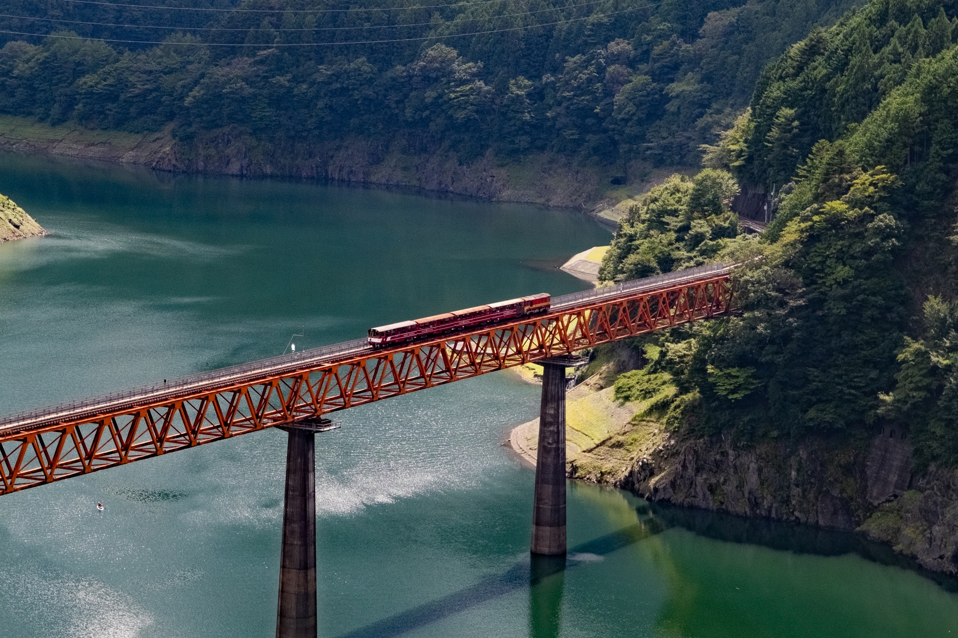 両脇に高さ70メートルの「奥大井レインボーブリッジ」が架かり、鉄道でも徒歩でも湖上駅に到着することが出来ます。