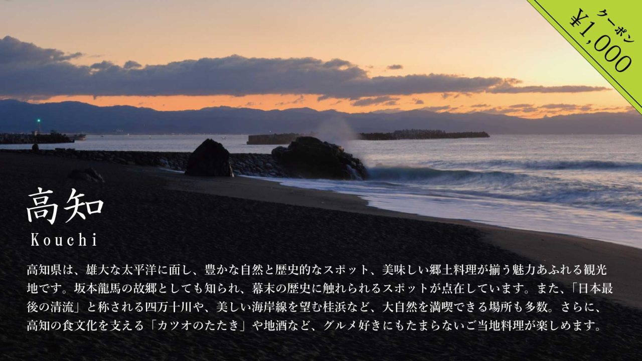 高知県は、雄大な太平洋に面し、豊かな自然と歴史的なスポット、美味しい郷土料理が揃う魅力あふれる観光地です。坂本龍馬の故郷としても知られ、幕末の歴史に触れられるスポットが点在しています。また、「日本最後の清流」と称される四万十川や、美しい海岸線を望む桂浜など、大自然を満喫できる場所も多数。さらに、高知の食文化を支える「カツオのたたき」や地酒など、グルメ好きにもたまらないご当地料理が楽しめます。