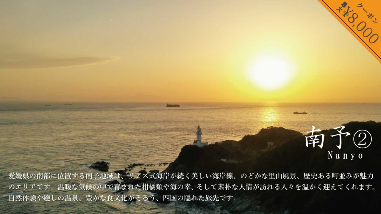 愛媛県の南部に位置する南予地域は、リアス式海岸が続く美しい海岸線、のどかな里山風景、歴史ある町並みが魅力のエリアです。温暖な気候の中で育まれた柑橘類や海の幸、そして素朴な人情が訪れる人々を温かく迎えてくれます。自然体験や癒しの温泉、豊かな食文化がそろう、四国の隠れた旅先です。