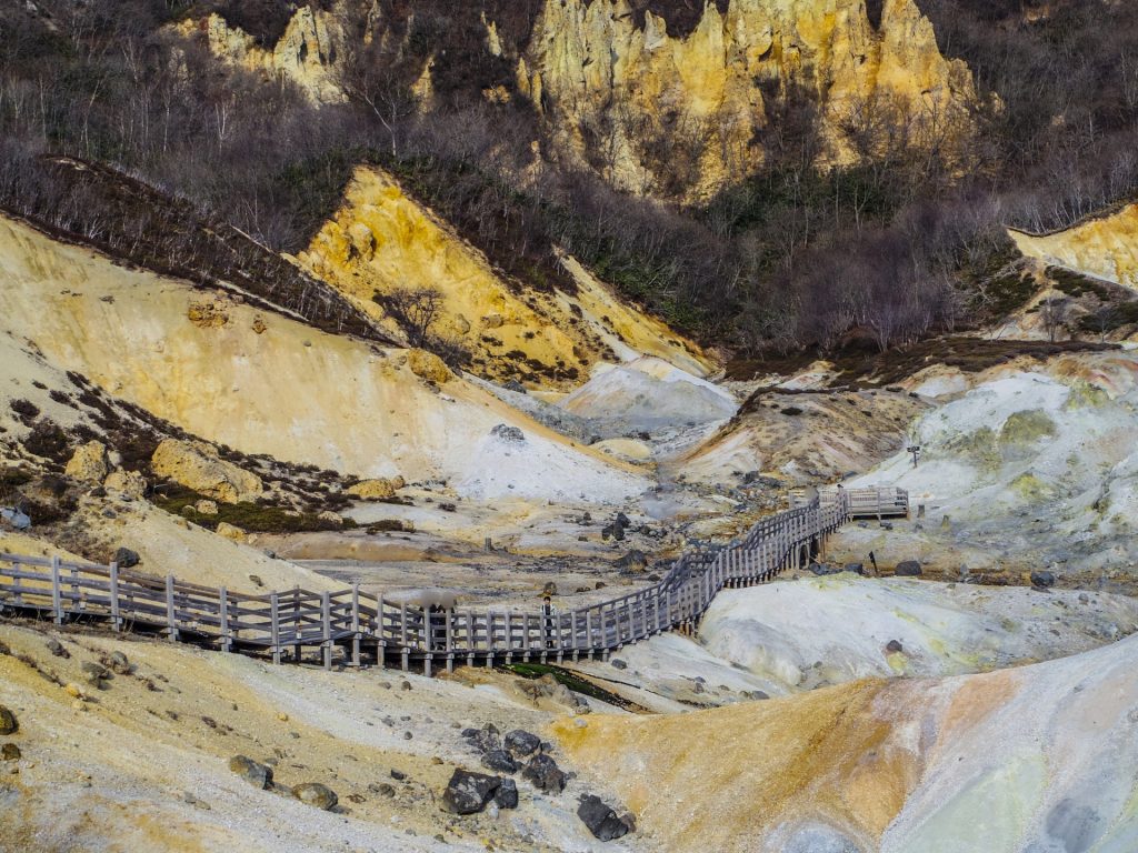 登別市の象徴ともいえる「地獄谷」は、約1万年前の火山活動によってできた火口跡で、今でも噴気や熱泥、熱湯が湧き上がり、まるで地球の鼓動を感じるような迫力があります。湯けむりが立ち上る光景は独特で、そのダイナミックな自然美は訪れる人々に深い印象を与えます。