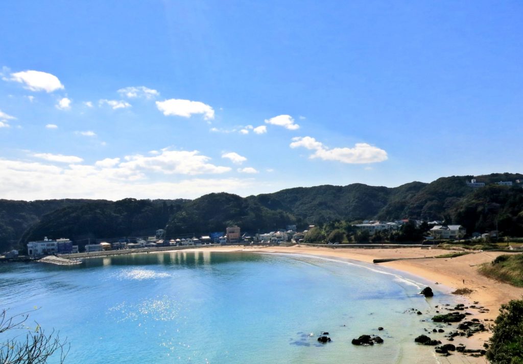 入り江に出来た広々とした砂浜が広がる静かで美しいビーチ。