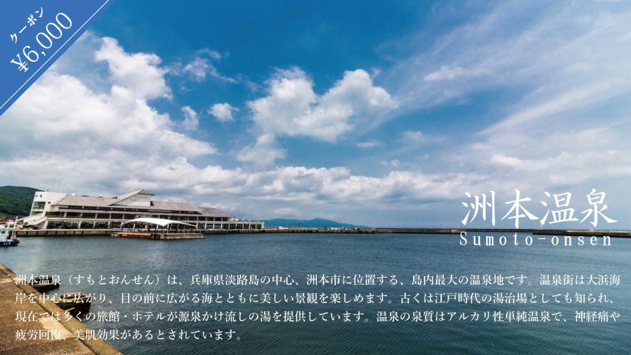 洲本温泉(すもとおんせん)は、兵庫県淡路島の中心、洲本市に位置する、島内最大の温泉地です。温泉街は大浜海岸を中心に広がり、目の前に広がる海とともに美しい景観を楽しめます。古くは江戸時代の湯治場としても知られ、現在では多くの旅館・ホテルが源泉かけ流しの湯を提供しています。温泉の泉質はアルカリ性単純温泉で、神経痛や疲労回復、美肌効果があるとされています。