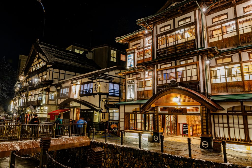 大正時代のレトロな街並みが特徴の銀山温泉は、山間の静かな場所に位置しており、温泉宿が並ぶ情緒あふれる温泉地です。特に雪の降る冬は、ライトアップされた宿泊施設とともに幻想的な景観が楽しめ、訪れる人々に感動を与えます。
