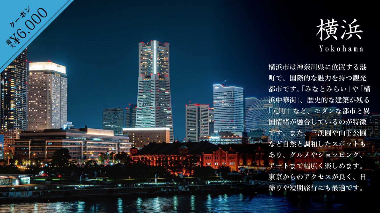 横浜市は神奈川県に位置する港町で、国際的な魅力を持つ観光都市です。「みなとみらい」や「横浜中華街」、歴史的な建築が残る「元町」など、モダンな都市と異国情緒が融合しているのが特徴です。また、三渓園や山下公園など自然と調和したスポットもあり、グルメやショッピング、アートまで幅広く楽しめます。東京からのアクセスが良く、日帰りや短期旅行にも最適です。